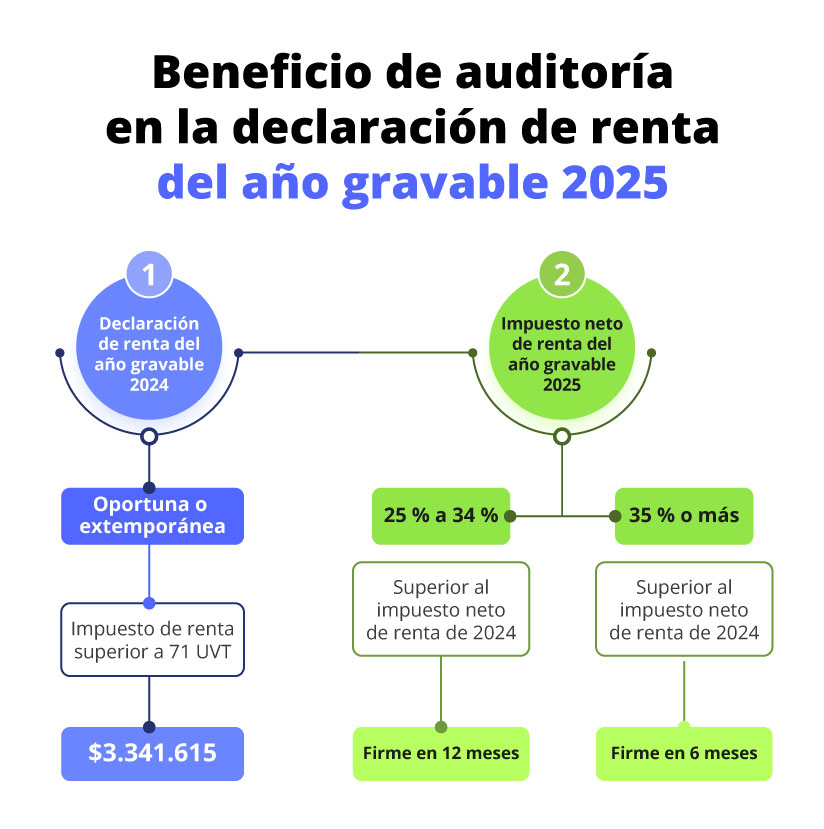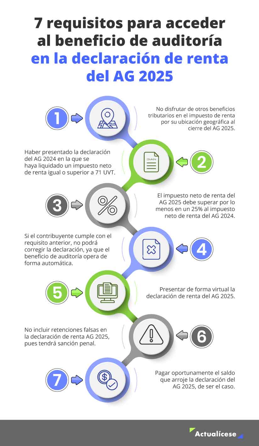 Para lograr el mencionado beneficio de auditoría en la declaración de renta del año gravable 2025, se hará necesario que la persona jurídica, persona natural o sucesión ilíquida cumpla con la totalidad de los siguientes requisitos (más detalles en Beneficio de auditoría para el cierre del año gravable 2025):