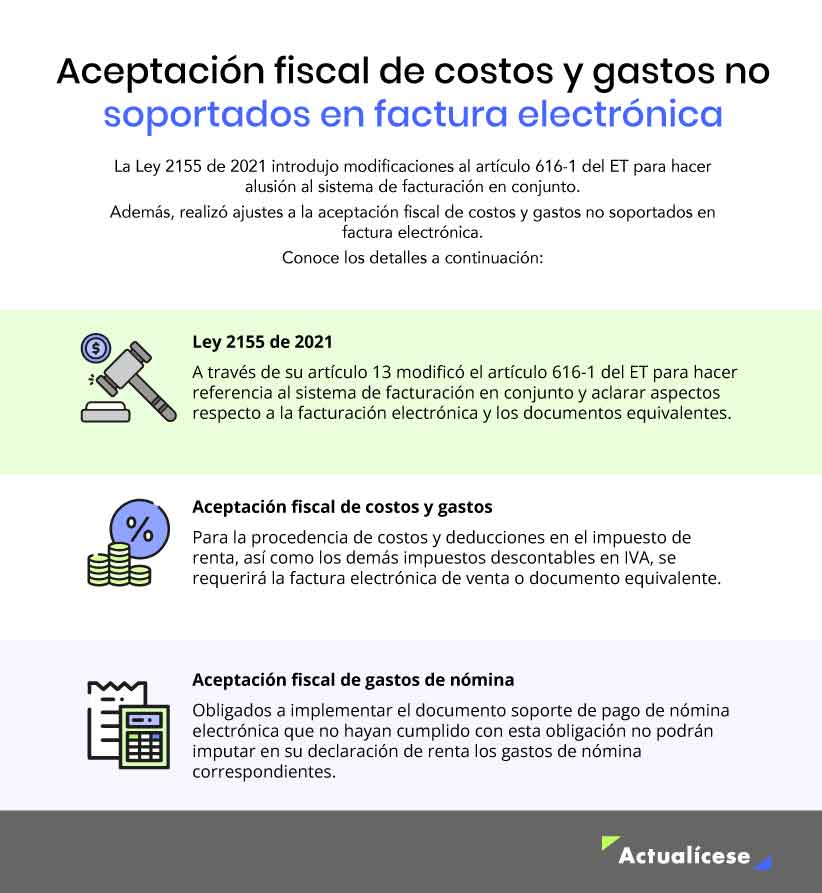 Por tanto, se puede evidenciar que la norma eliminó el límite de aceptación fiscal de los costos y gastos no soportados en factura electrónica, requiriendo que para dicha aceptación los respectivos costos y deducciones cuenten con el debido soporte.