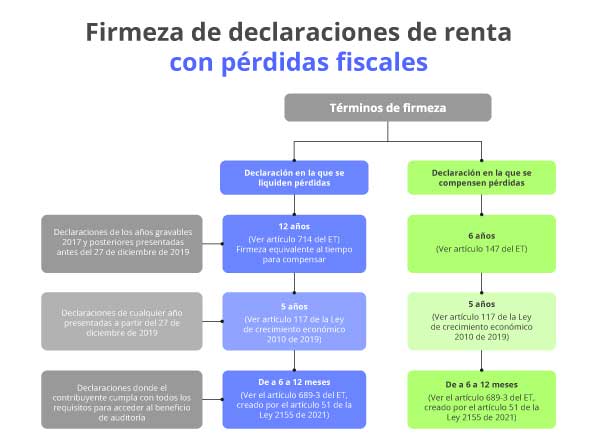 Sin embargo, si el contribuyente cumple con todos los requisitos del artículo 689-3 del ET (beneficio de auditoría, creado con el artículo 51 de la Ley 2155 de 2021), la declaración podría quedar en firme en solo 6 o 12 meses siguientes a su presentación (pero en todo caso la Dian podría auditar si la pérdida fiscal es procedente y por tanto las compensaciones posteriores y podría incluir una renta liquida gravable en años siguientes, sin que esto signifique que deba modificar la declaración que ya estaría en firme):