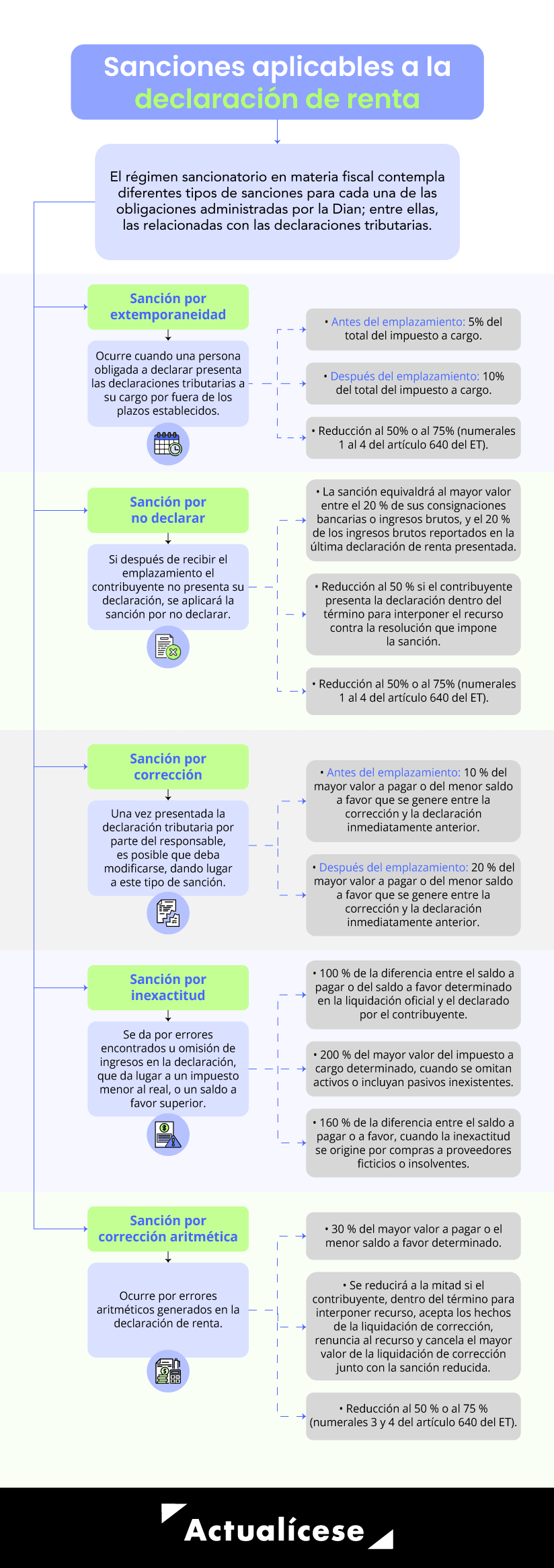 El régimen sancionatorio en materia fiscal contempla diferentes tipos de sanciones para cada una de las obligaciones administradas por la Dian entre ellas las relacionadas con las declaraciones tributarias y se encuentran contempladas en los artículos 641 al 650 2 del Estatuto Tributario. A continuación relacionamos las principales sanciones: