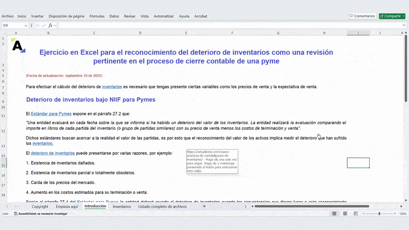 Este liquidador para el reconocimiento del deterioro de inventarios está incluido en el Pack de Formatos para el cierre contable y fiscal del año gravable 2022. Si ya tienes este producto, no es necesario que lo adquieras.