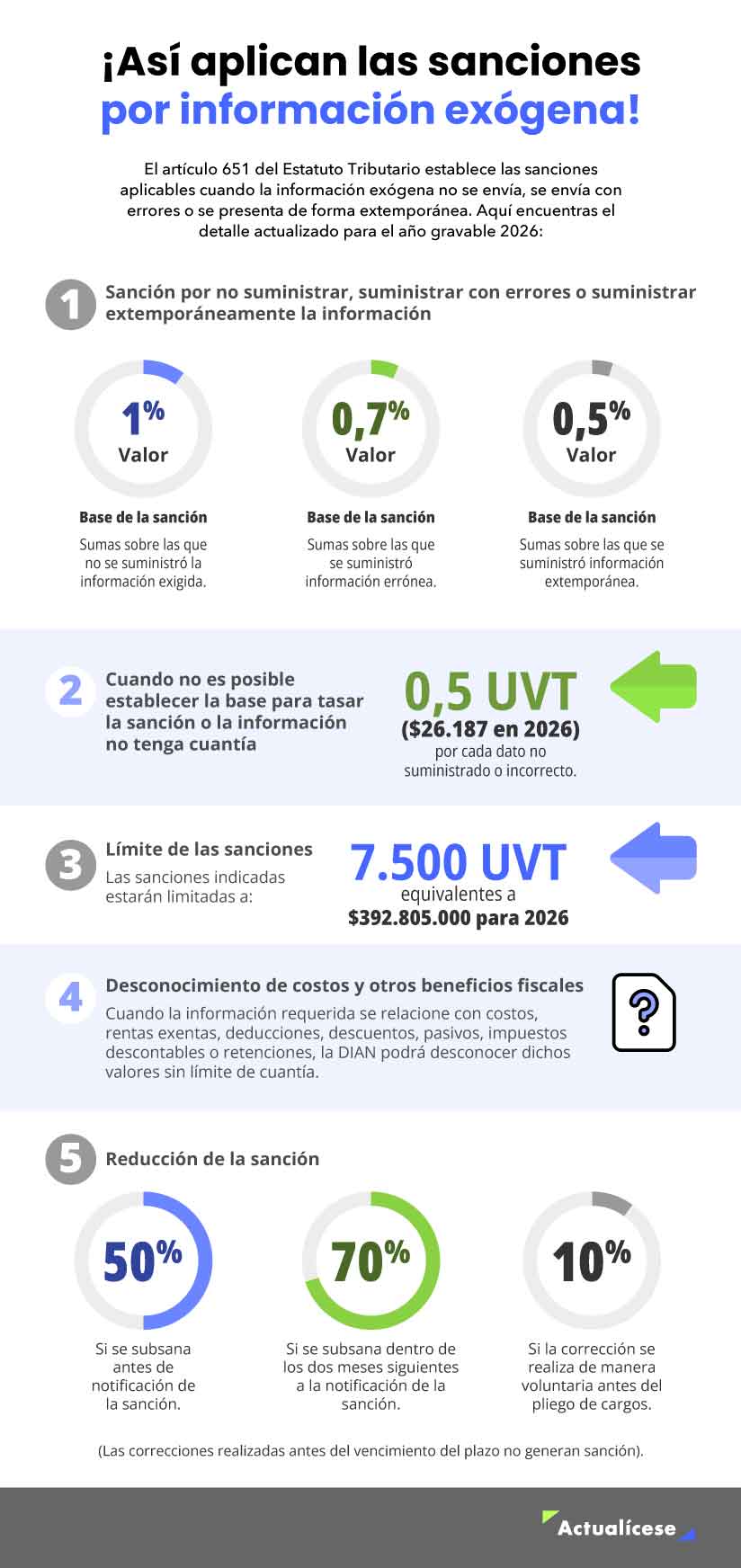 De acuerdo con el artículo 1.3.11.1. de la Resolución 000227 de 2025, cuando la información exógena no se suministre dentro de los plazos establecidos, el contenido presente errores o no corresponda a lo solicitado, dará lugar a las sanciones contempladas en el artículo 651 del ET (modificado por el artículo 80 de la Ley de reforma tributaria 2277 de 2022).