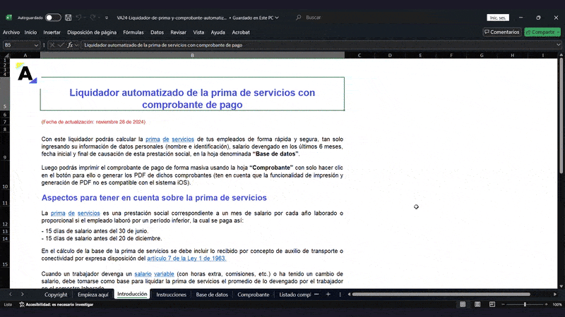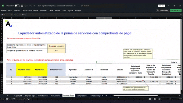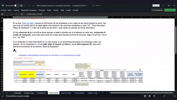 En este liquidador podrás calcular la prima de servicios de tus empleados de forma rápida, ingresando su información de datos personales, salario devengado en los últimos 6 meses, fecha inicial y final de causación de esta prestación social en la hoja de cálculo que hemos denominado “Base de datos”.