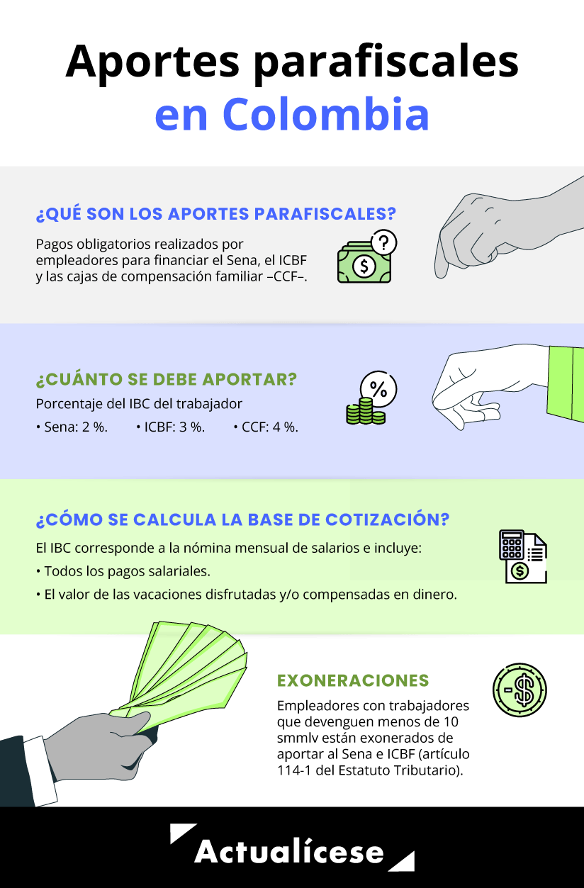 Los aportes parafiscales son contribuciones obligatorias por parte de los empleadores a las cajas de compensación familiar –CCF–, al Instituto Colombiano de Bienestar Familiar –ICBF– y al Servicio Nacional de Aprendizaje –Sena– liquidadas con base en los elementos que constituyen salario aplicando los siguientes porcentajes:
