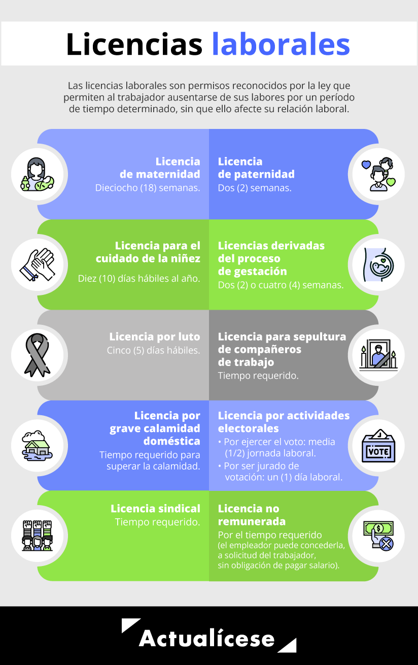 Las licencias laborales son permisos otorgados al trabajador por el empleador para ausentarse de la empresa y suspender sus actividades laborales por un período determinado, sin que se configure una causal para la terminación del contrato de trabajo. Existen dos tipos de licencias de trabajo:
