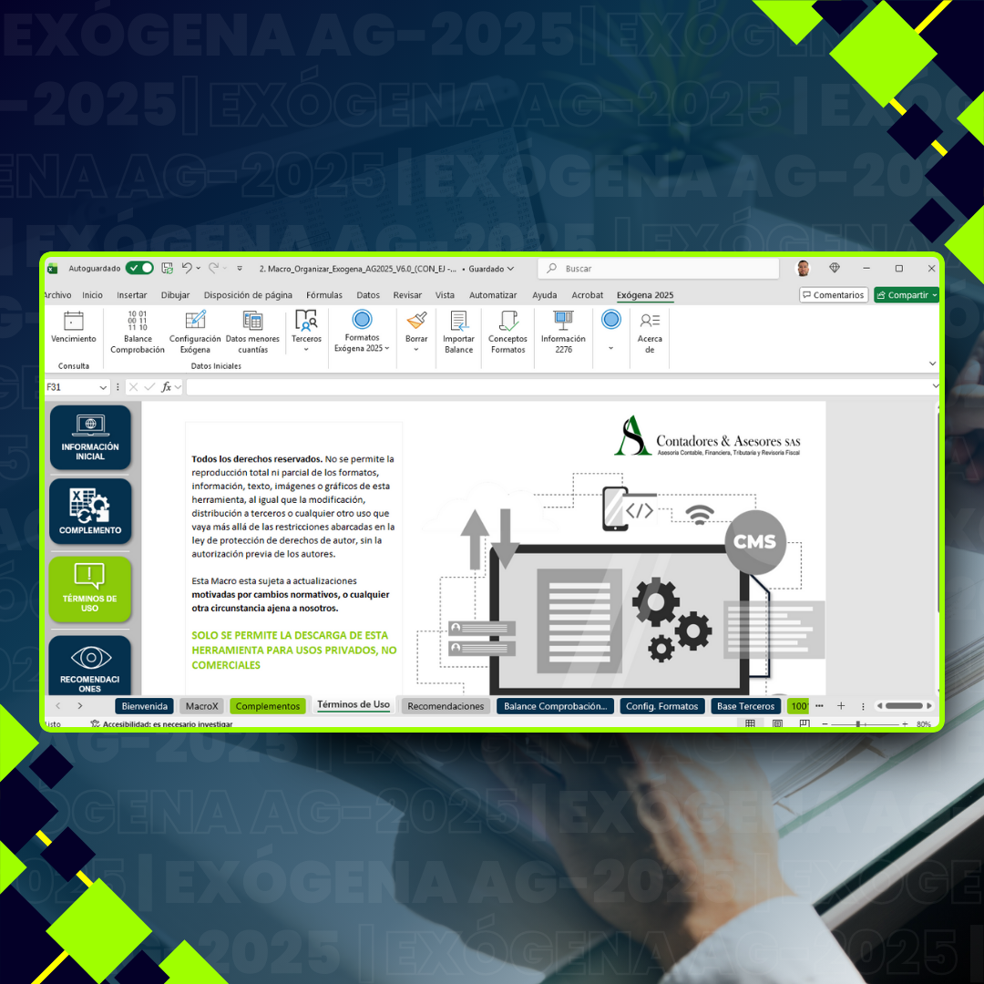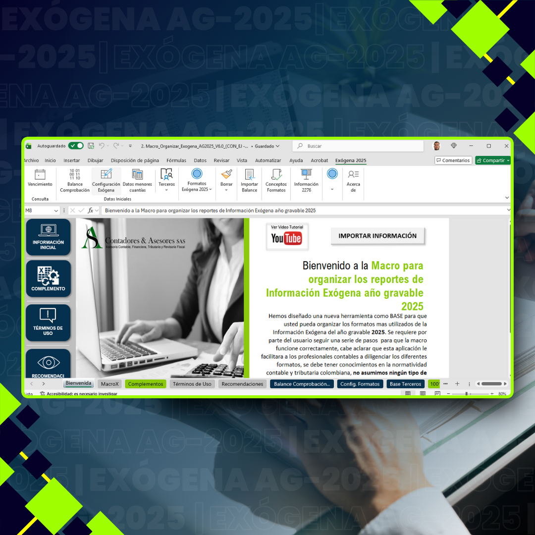 La Herramienta de Información Exógena AG 2025 ha sido diseñada para apoyar la preparación, revisión, validación y generación de los principales formatos de información exógena exigidos por la DIAN para el año gravable 2025, con base en la normatividad vigente aplicable a dicho período.