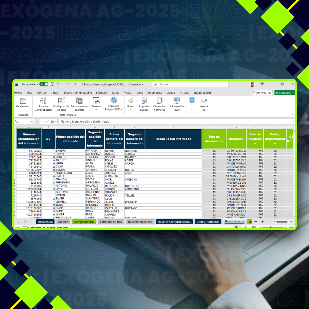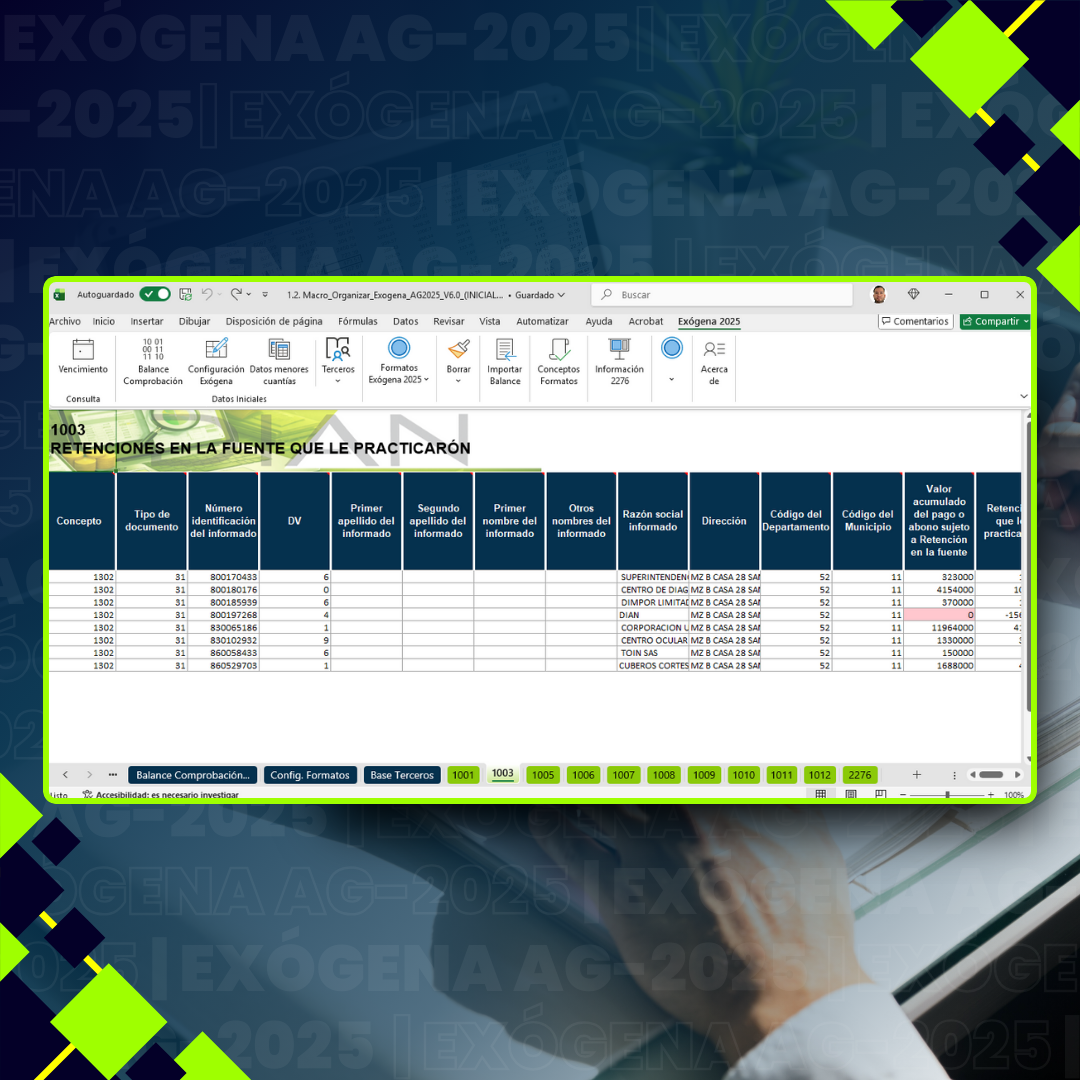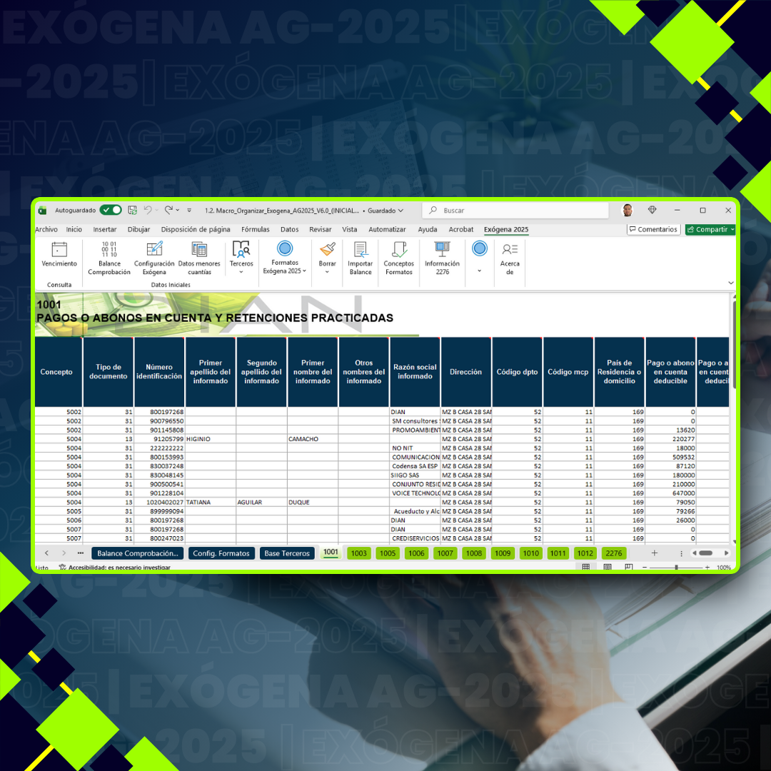 Con base en dicha parametrización, la Macro automatizada procesa la información, aplica validaciones básicas y organiza los datos conforme a las especificaciones técnicas vigentes, generando de manera automática los principales formatos de información exógena requeridos para el AG 2025, entre ellos: 1001, 1003, 1004, 1005, 1006, 1007, 1008, 1009, 1010, 1011, 1012, 2275 y 2276.