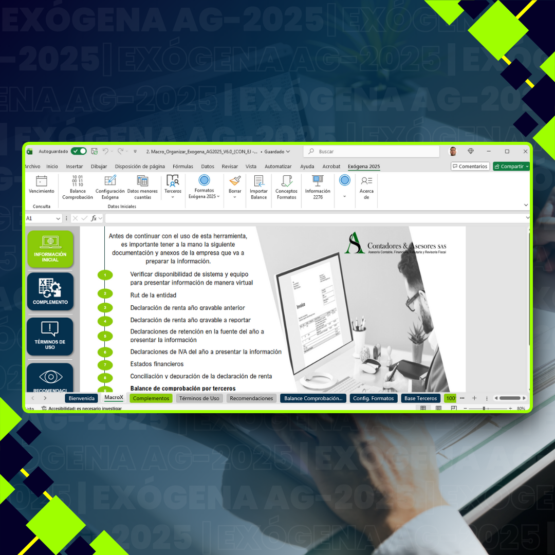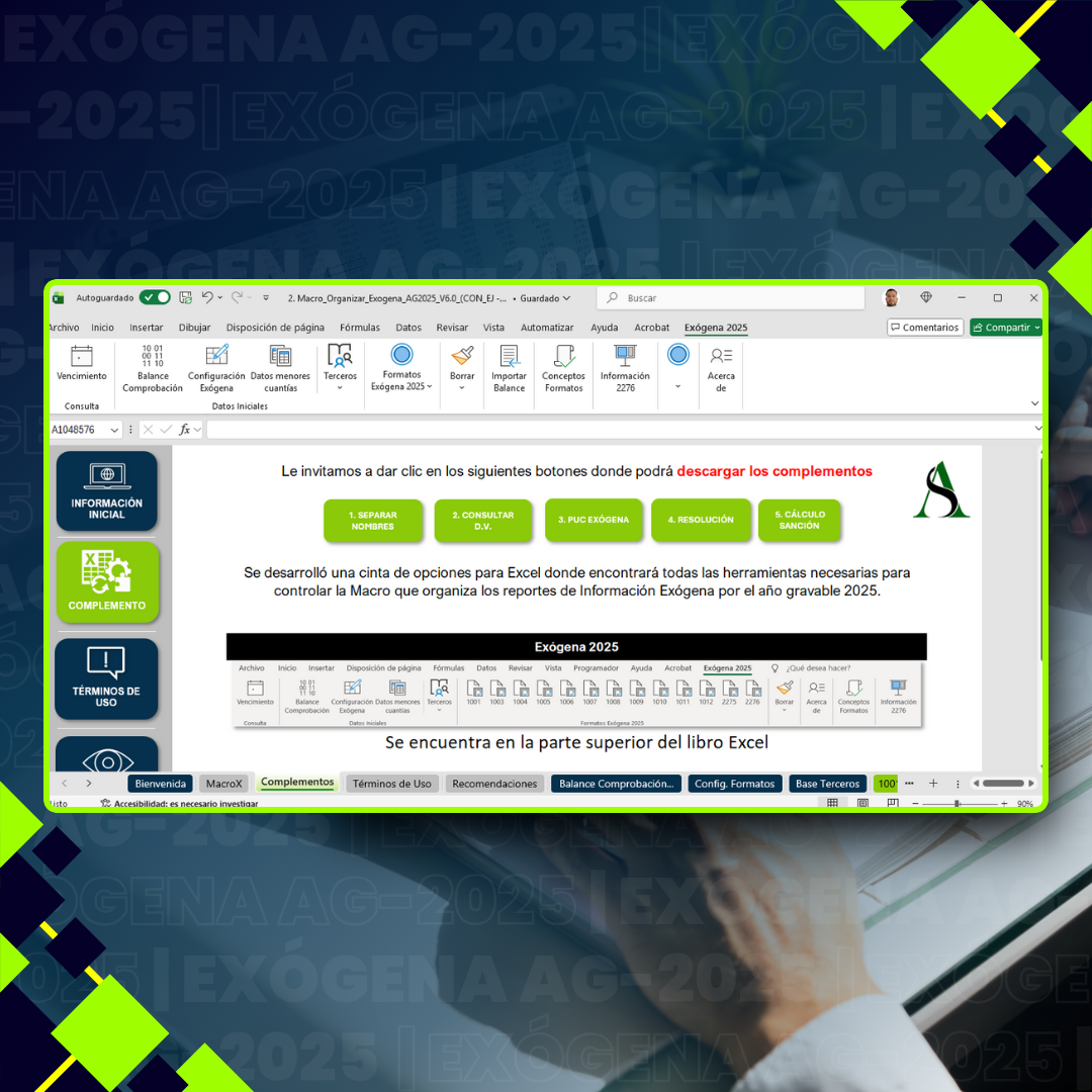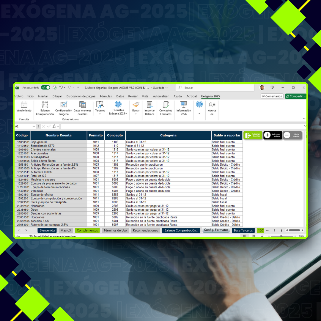Con base en dicha parametrización, la Macro automatizada procesa la información, aplica validaciones básicas y organiza los datos conforme a las especificaciones técnicas vigentes, generando de manera automática los principales formatos de información exógena requeridos para el AG 2025, entre ellos: 1001, 1003, 1004, 1005, 1006, 1007, 1008, 1009, 1010, 1011, 1012, 2275 y 2276.