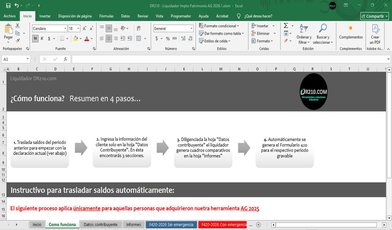 - Hoja para traslado de saldos automáticos: Esta función aplica para las personas que adquirieron exclusivamente el producto AG 2025 by DR210.com, el cual ayudará a agilizar los cálculos trasladando información del AG 2025 al AG 2026 en menos de 3 segundos.