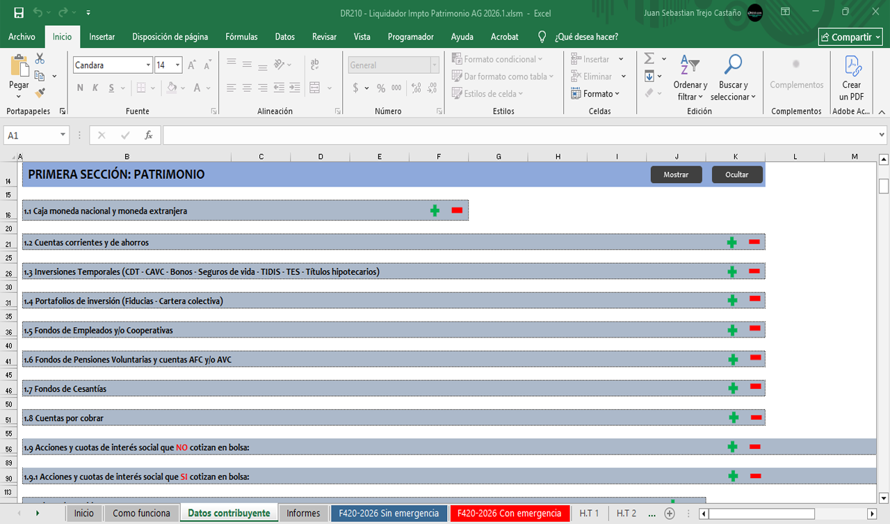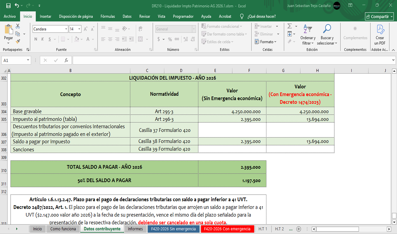 - Hoja “Formulario 420 – Con emergencia económica”: Borrador del formulario de la declaración del impuesto al patrimonio incluyendo lo dispuesto en el Decreto 1474/2025.
