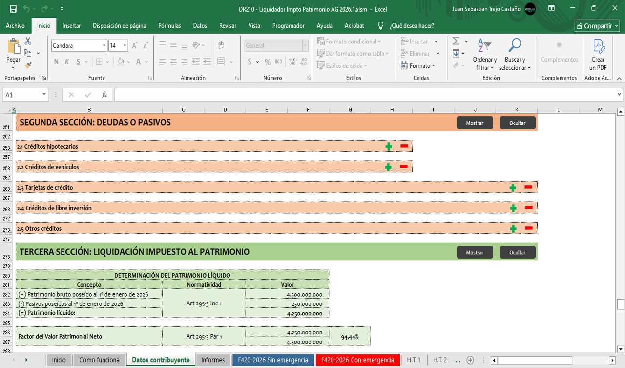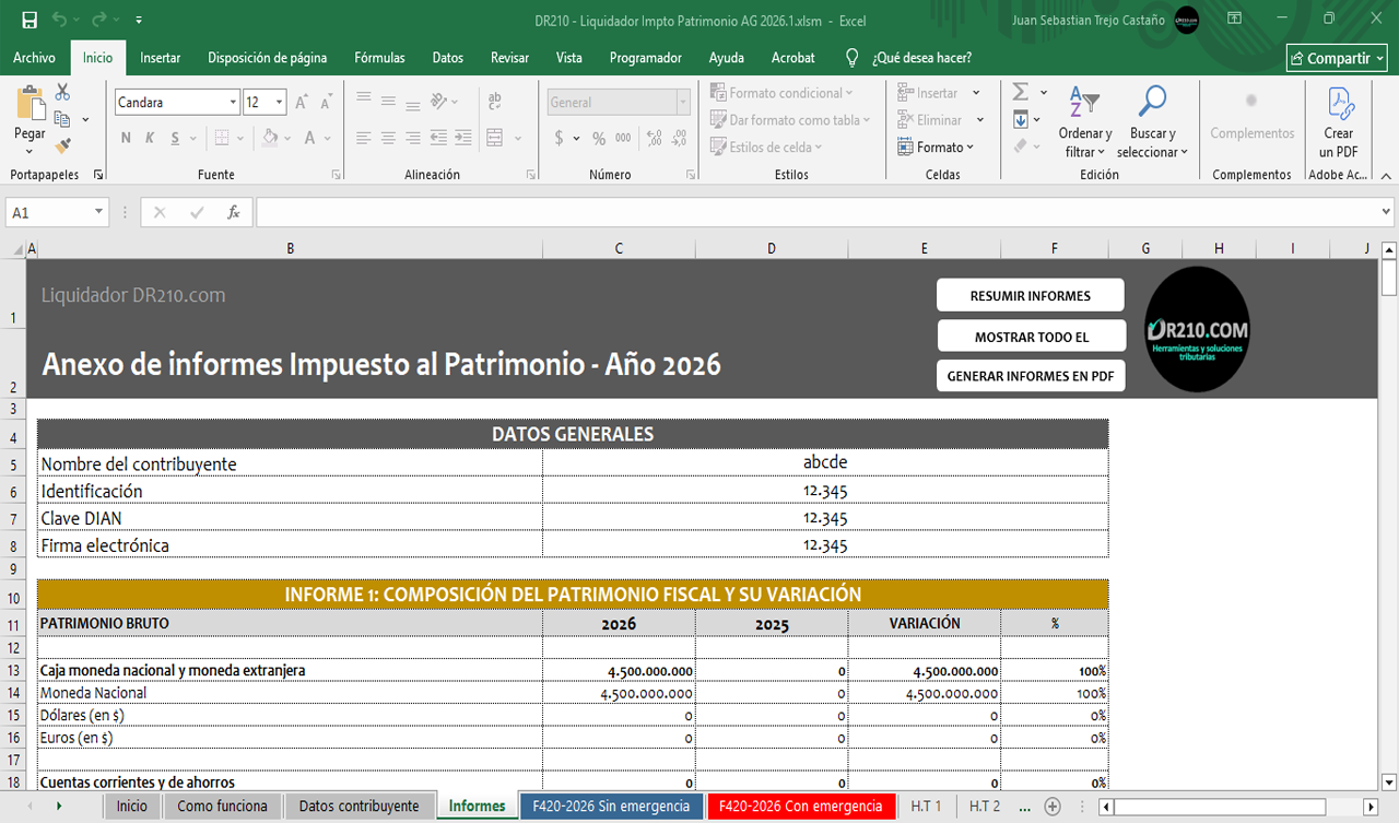 - Hoja “Informes”: Composición del patrimonio fiscal y su variación, Liquidación privada comparativa y su variación (sin emergencia económica), Liquidación privada comparativa y su variación (con emergencia económica). Incluye gráficos comparativos.