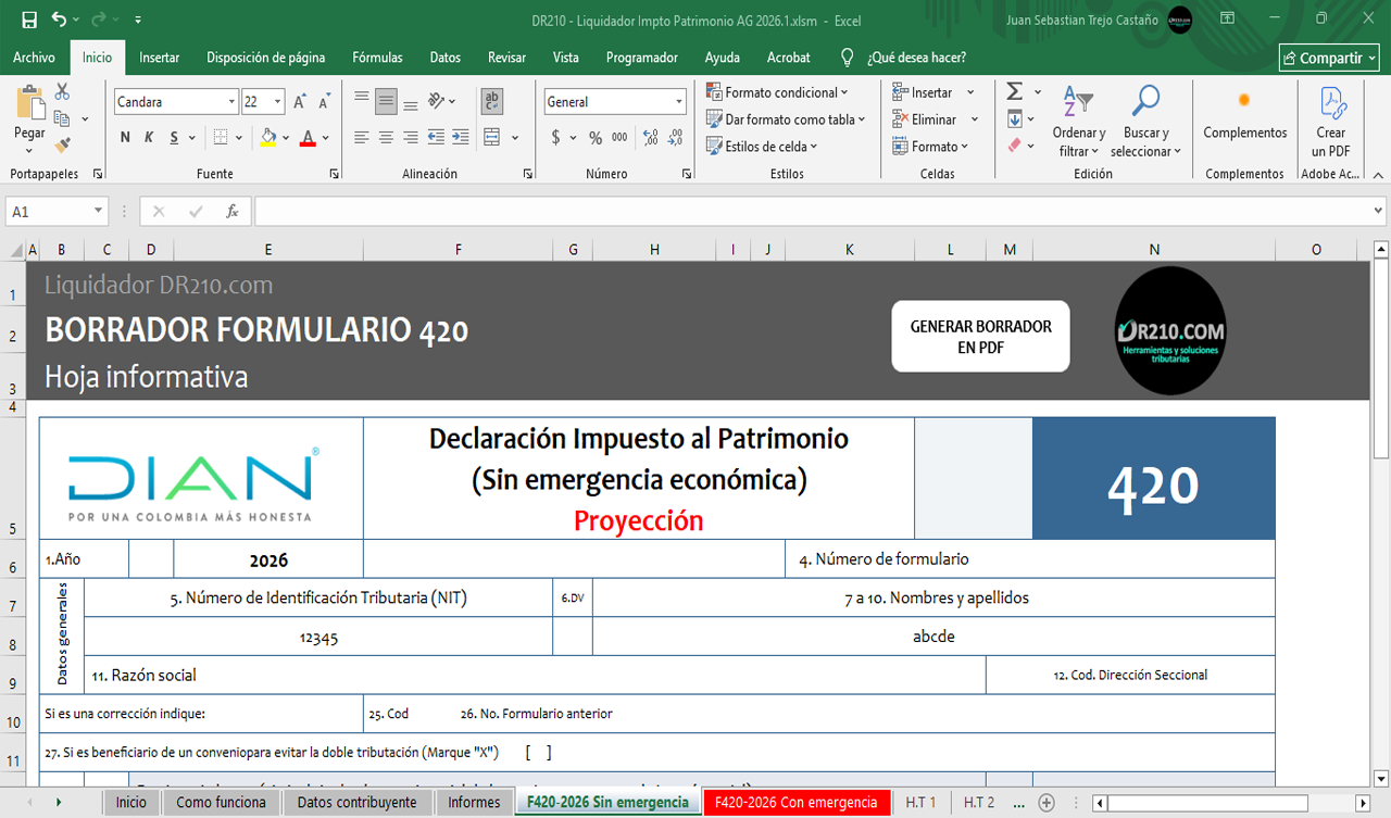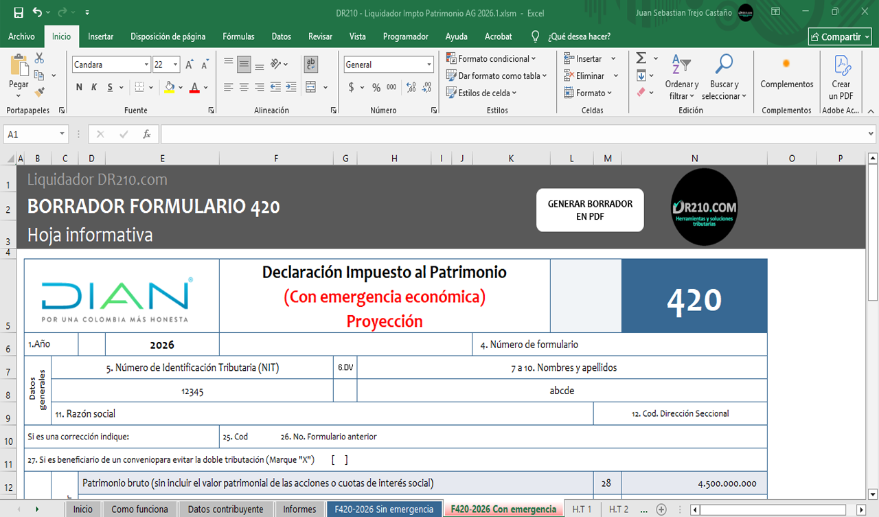 - Hoja “Formulario 420 – Sin emergencia económica”: Borrador del formulario de la declaración del impuesto al patrimonio sin tener en cuenta el Decreto 1474/2025.