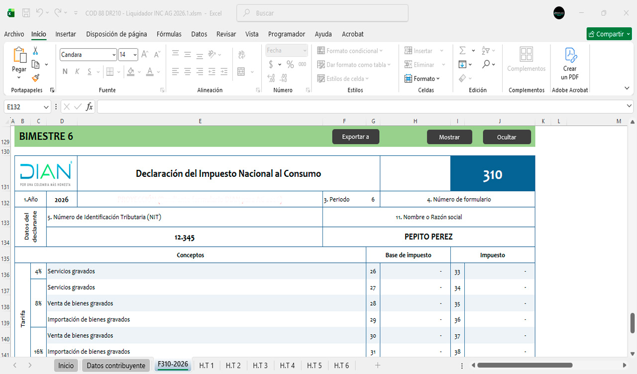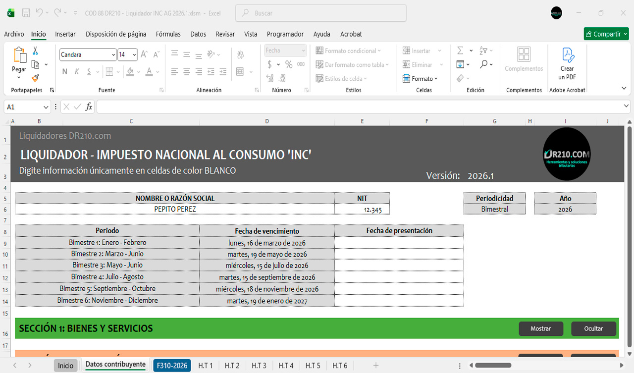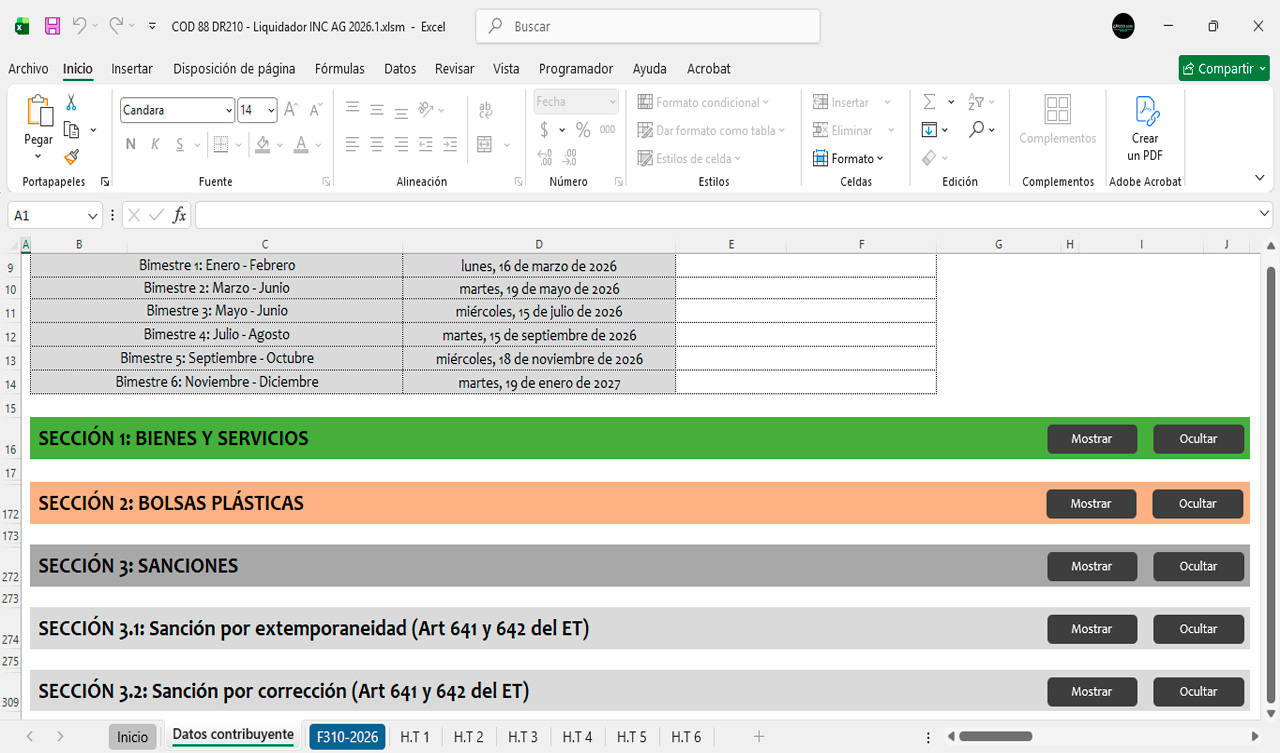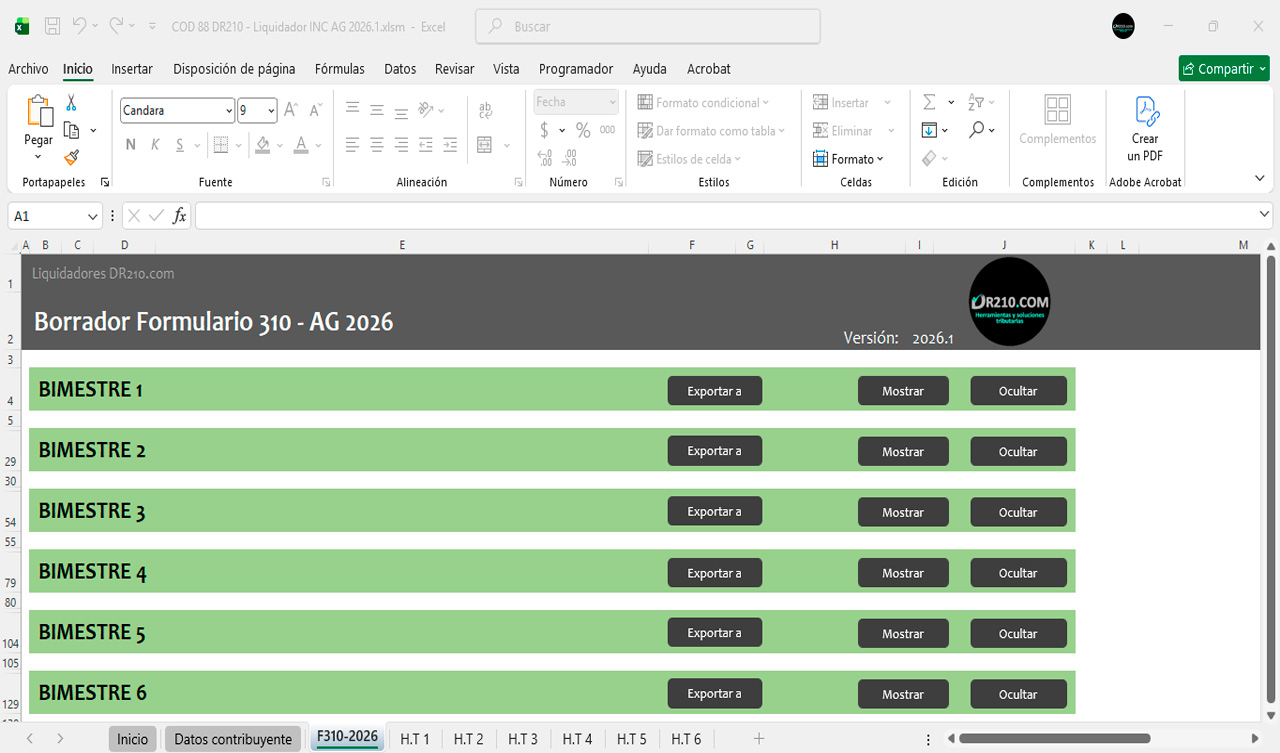 La herramienta contiene diferentes secciones para diligenciar automáticamente el Formulario 310 durante el año 2026 bimestre a bimestre.