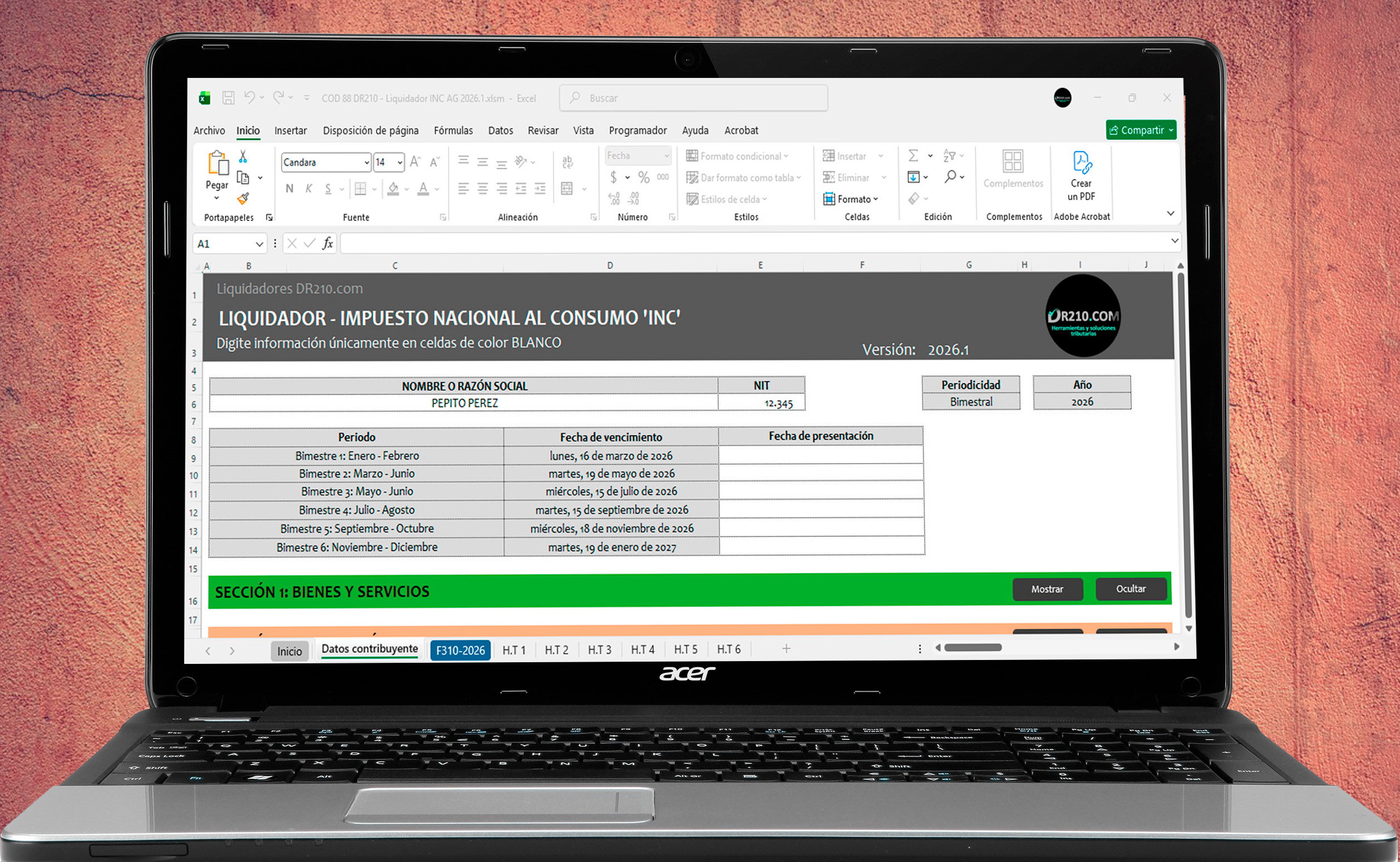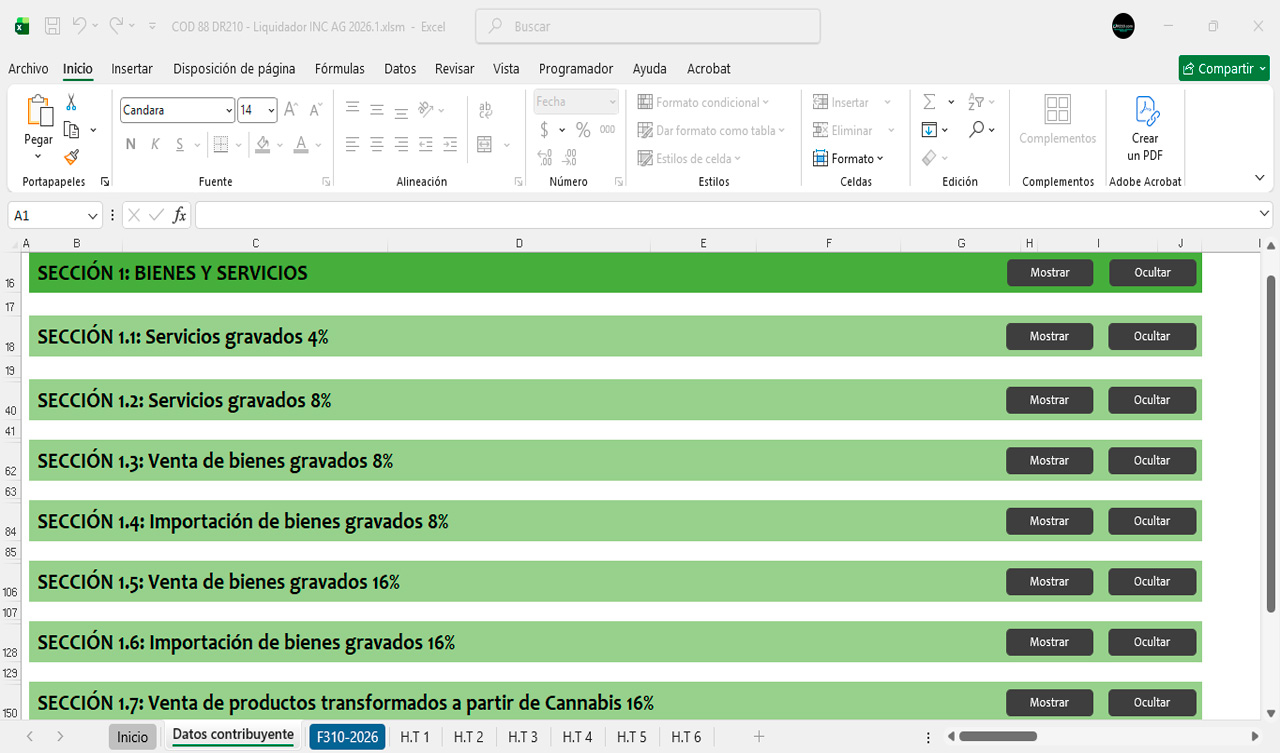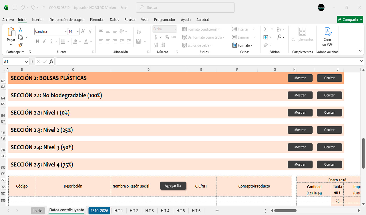 La herramienta contiene diferentes secciones para diligenciar automáticamente el Formulario 310 durante el año 2026 bimestre a bimestre.