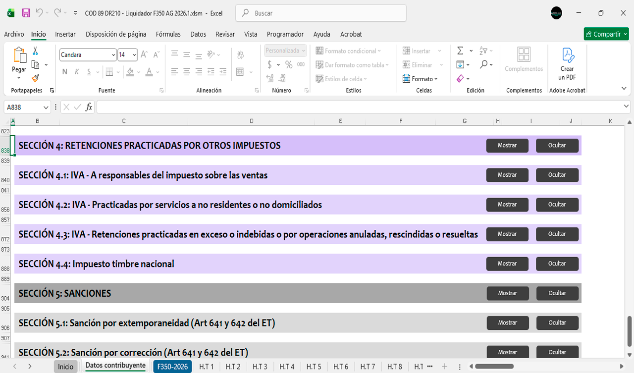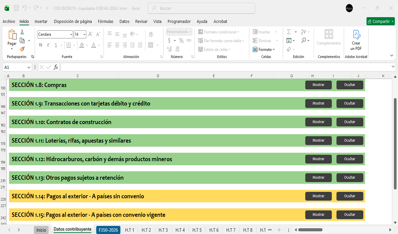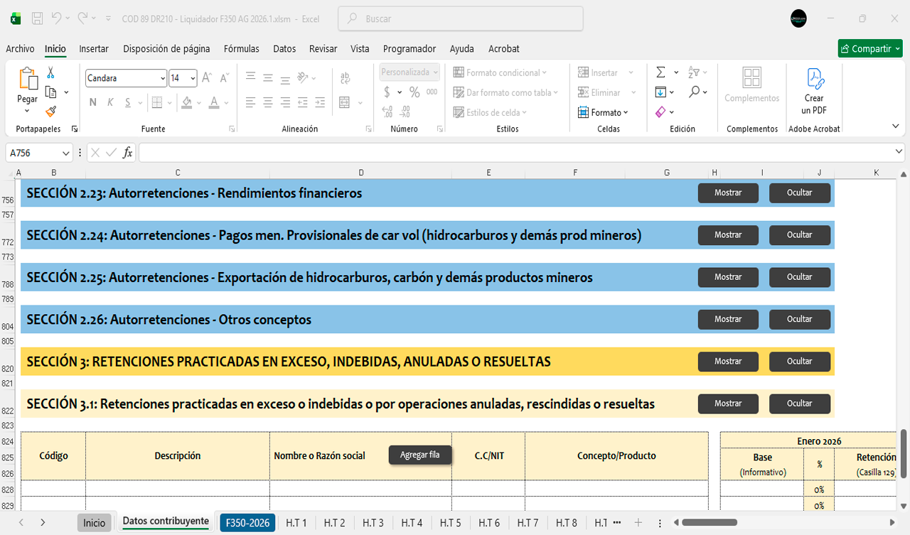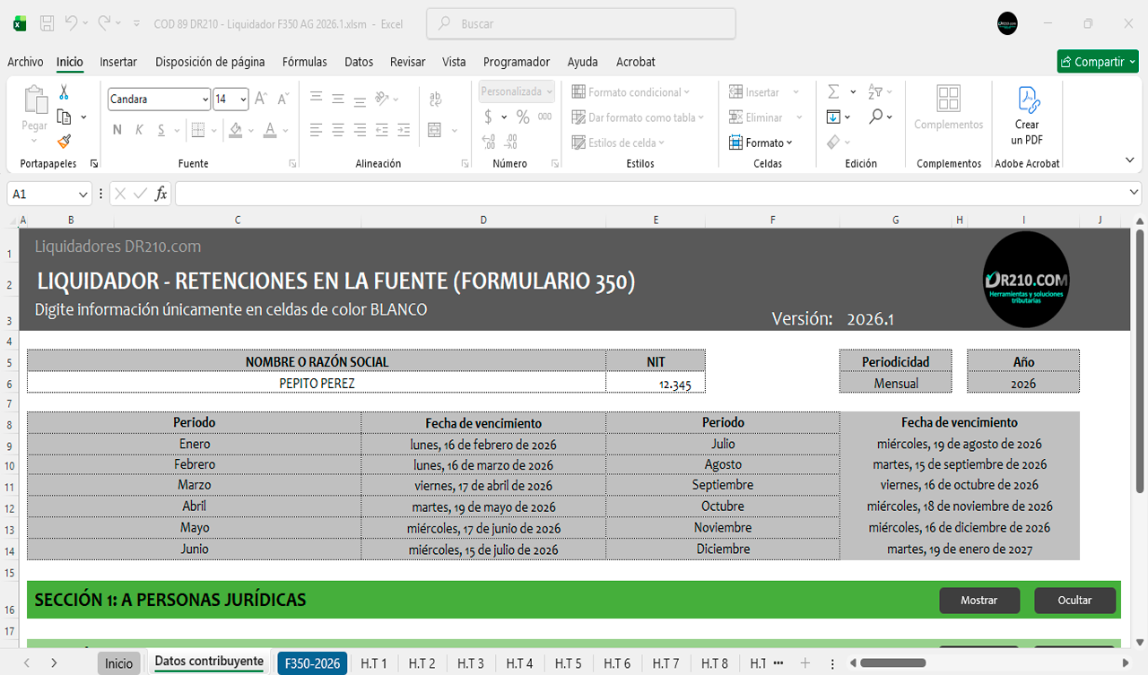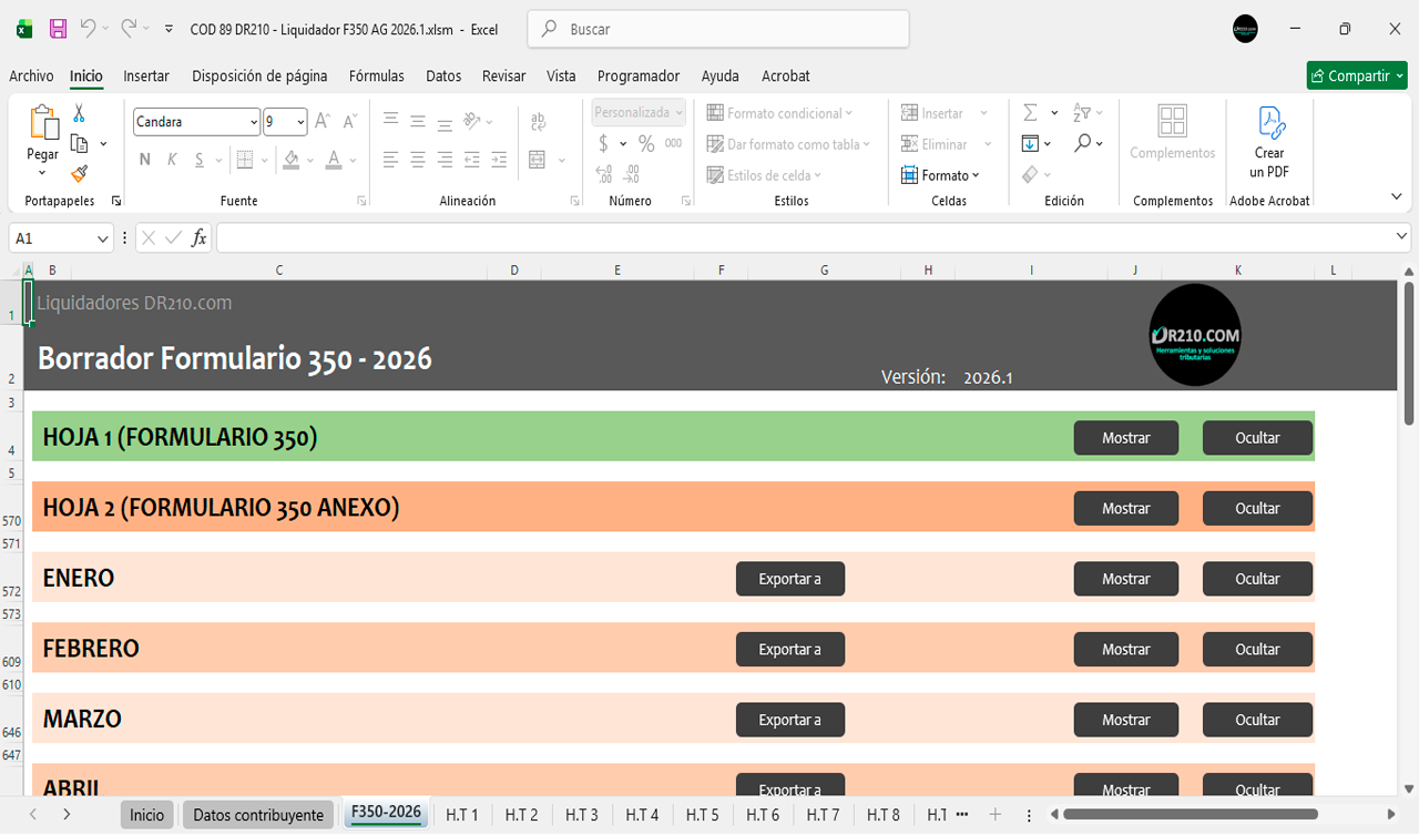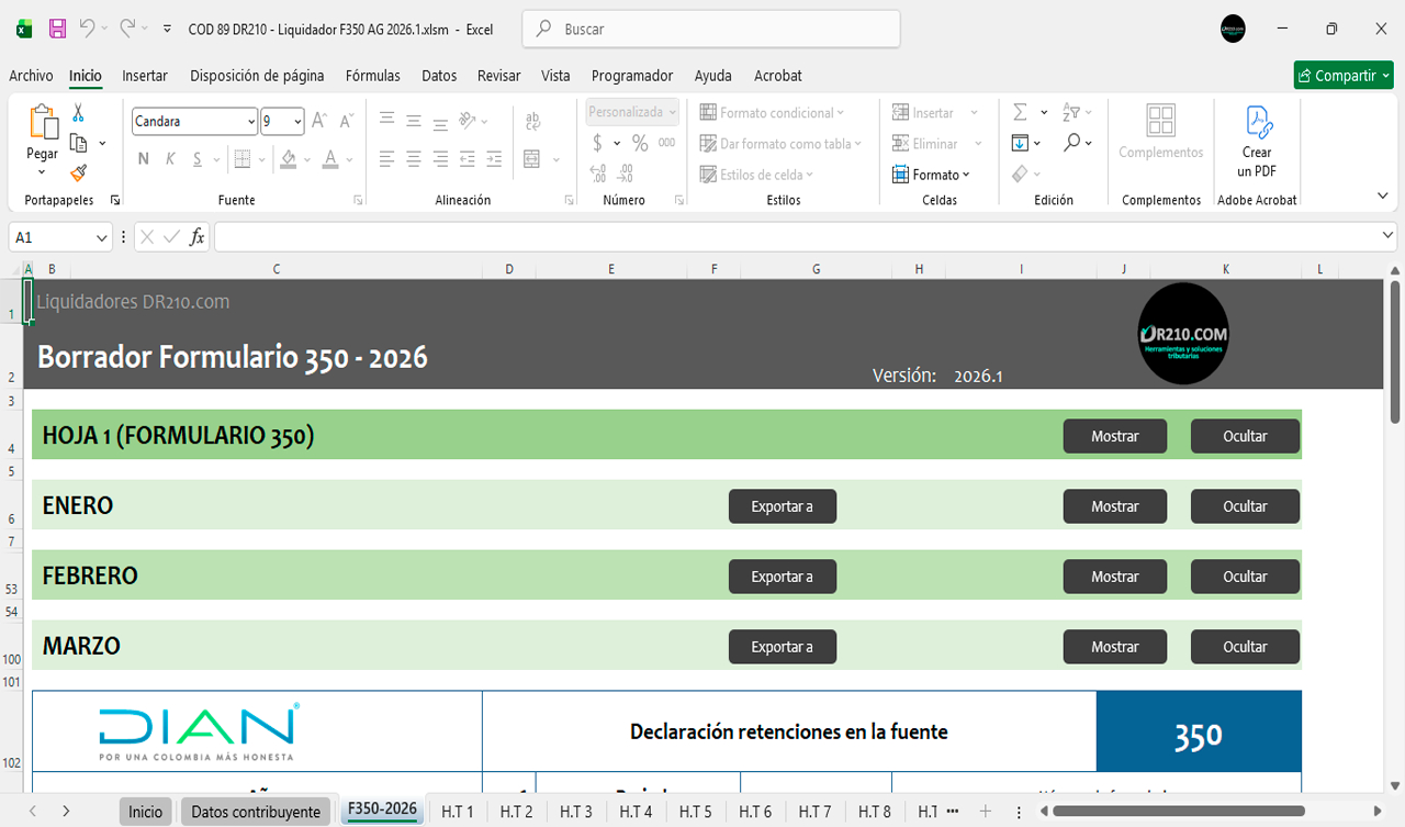 La herramienta contiene diferentes secciones para diligenciar automáticamente el Formulario 350 durante el año 2026 mes a mes.