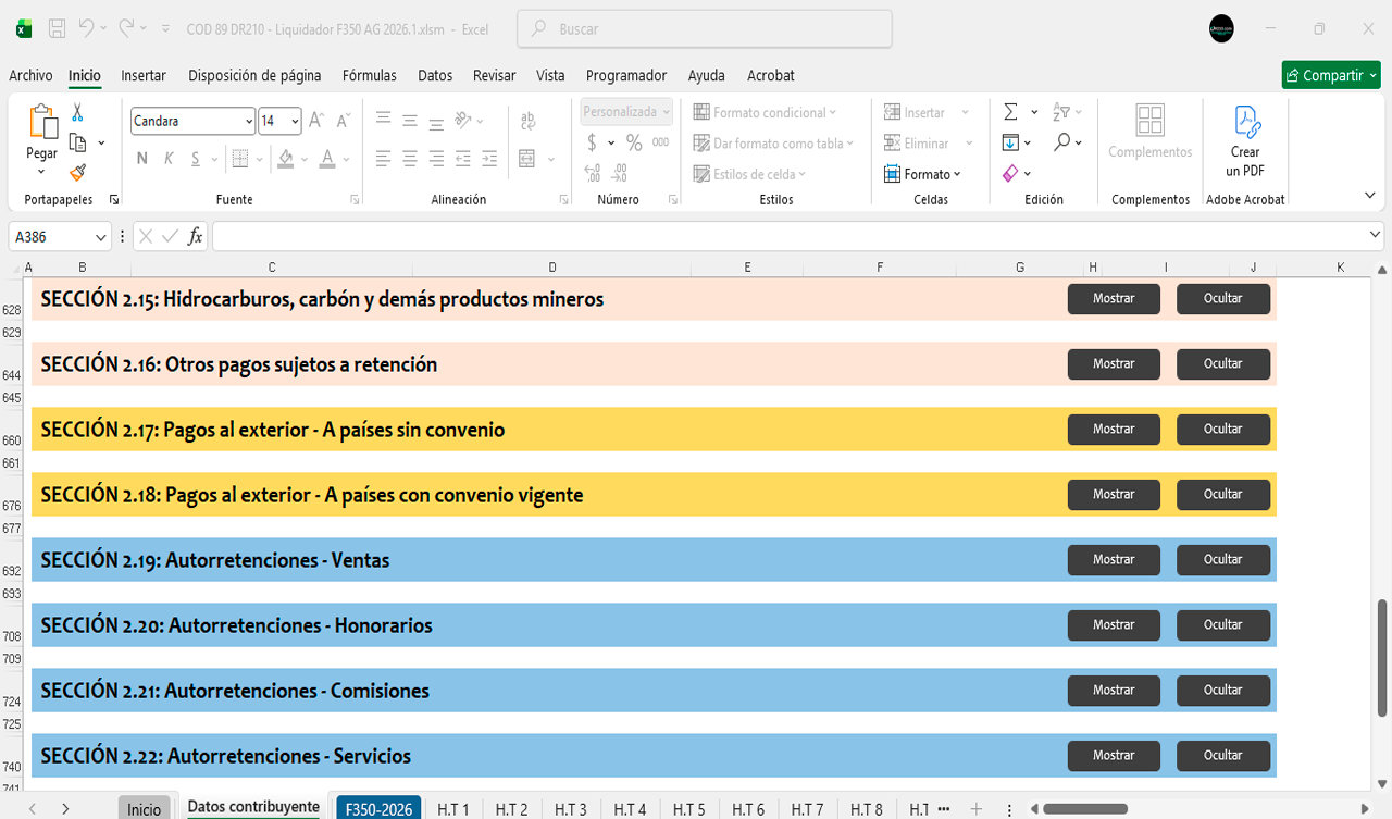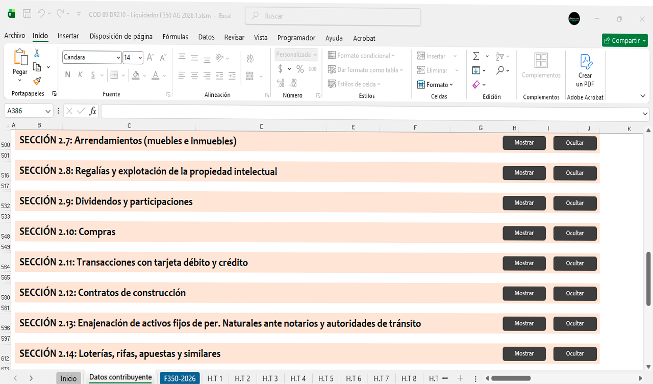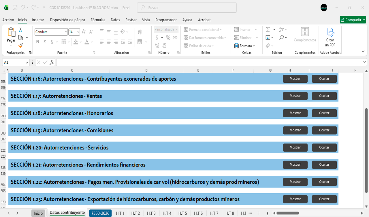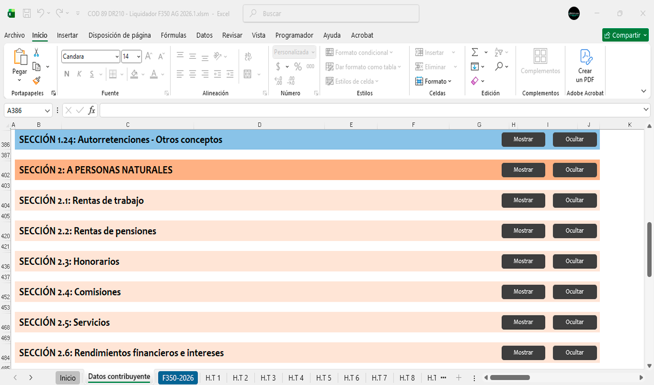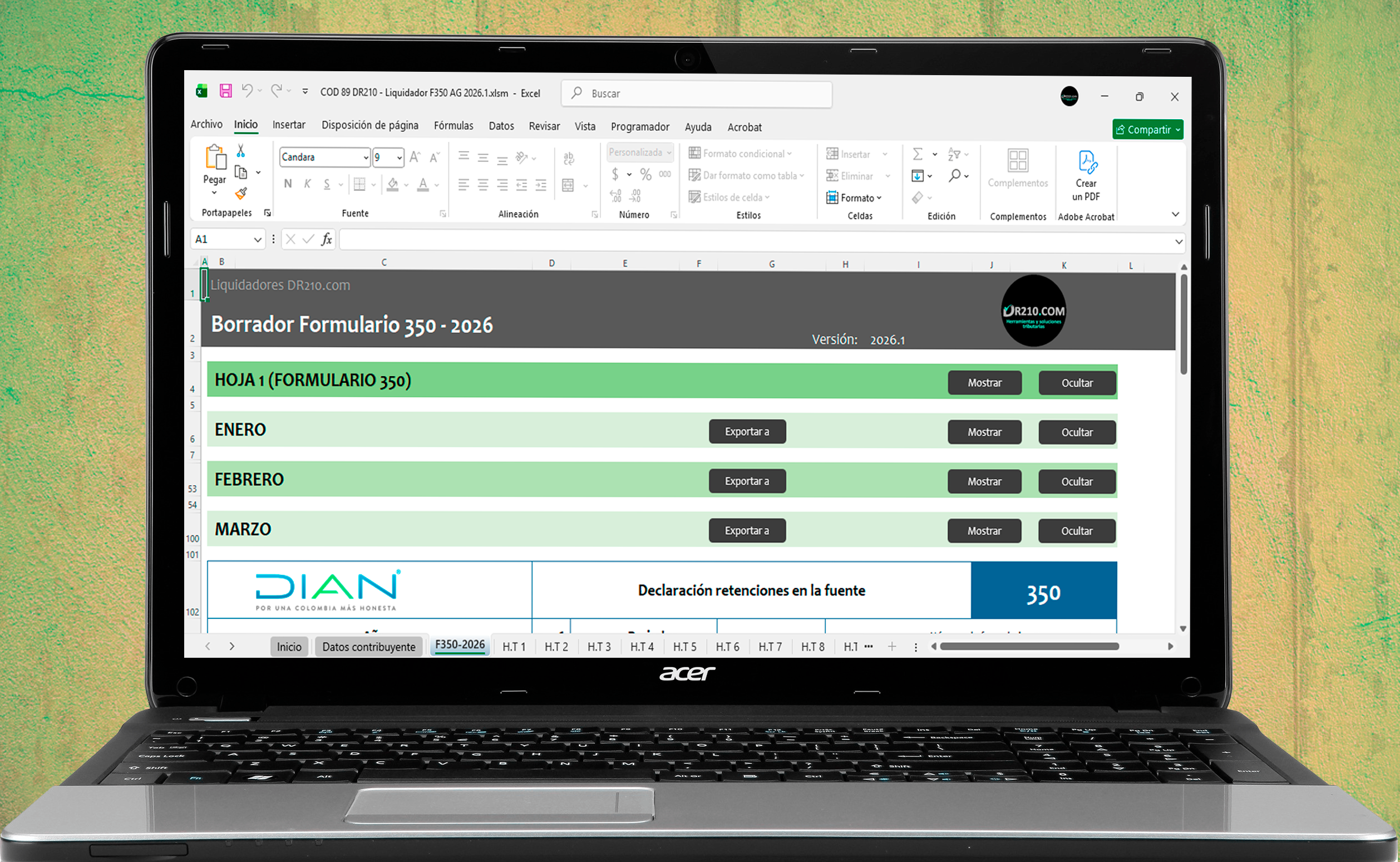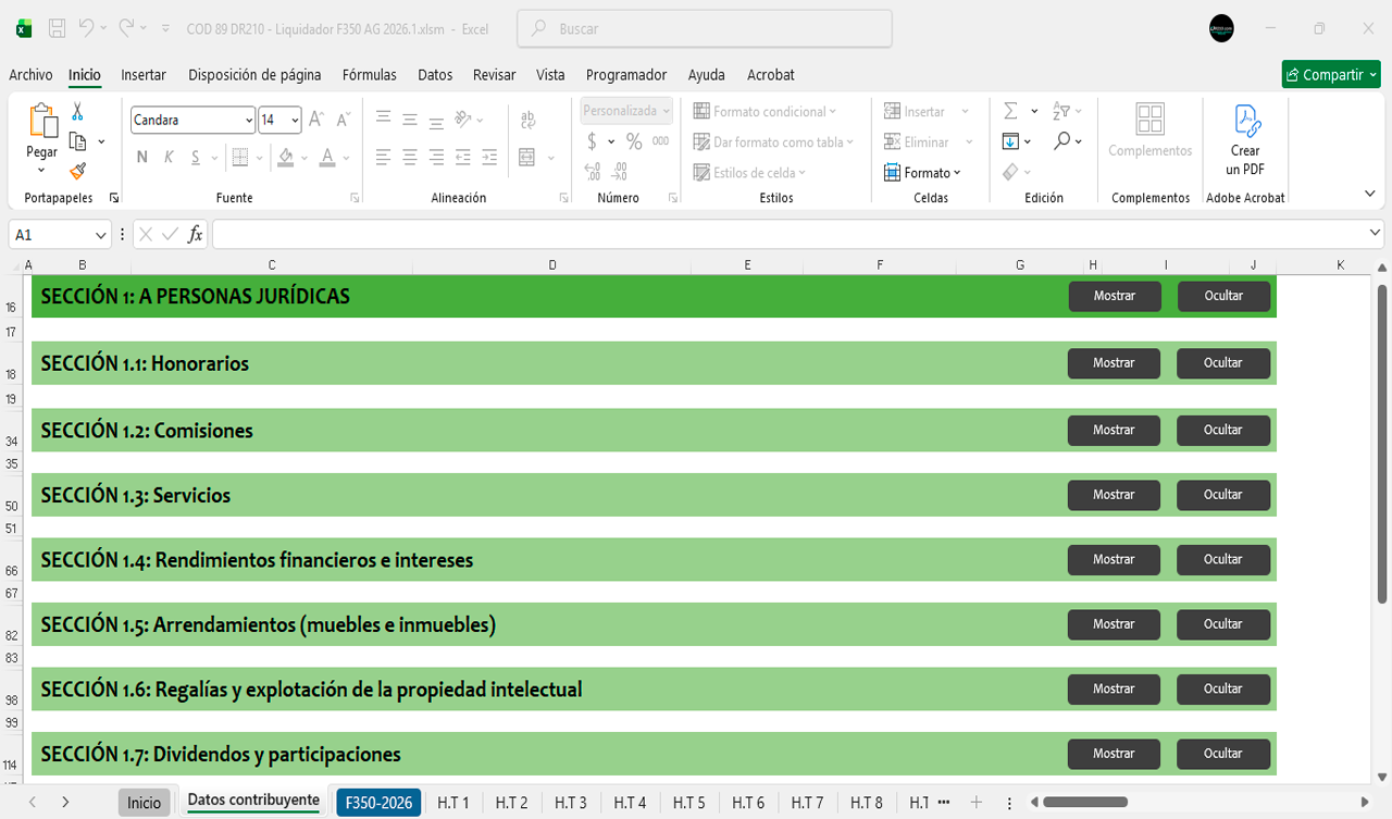 La herramienta contiene diferentes secciones para diligenciar automáticamente el Formulario 350 durante el año 2026 mes a mes.