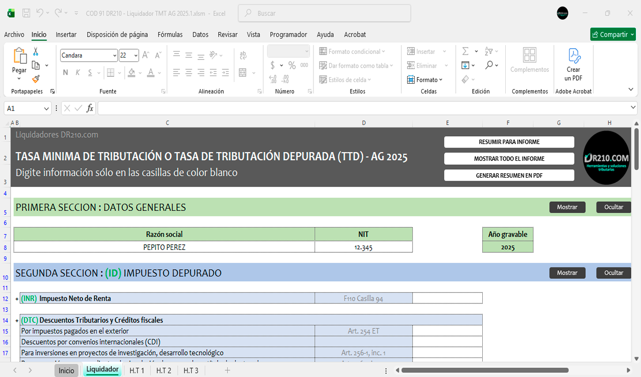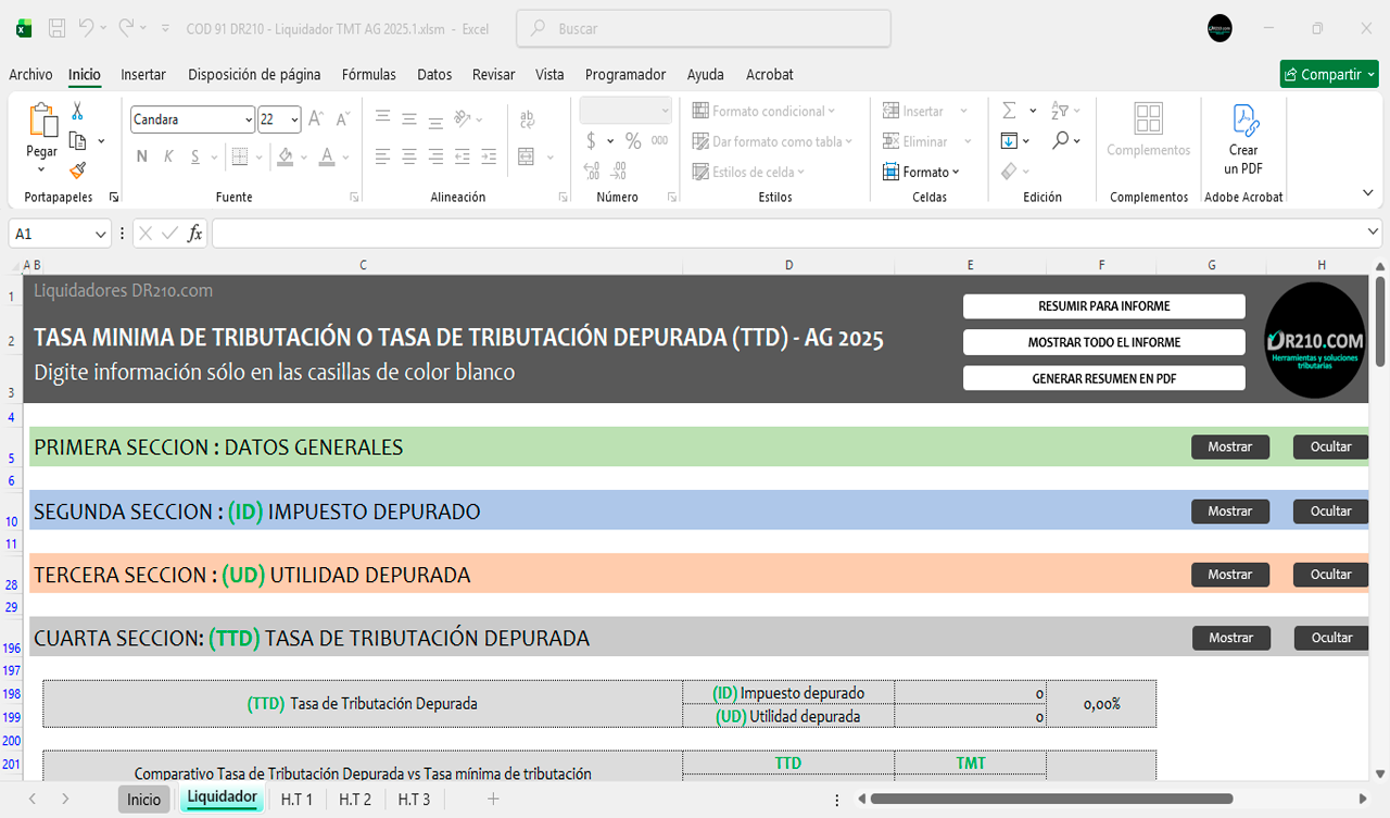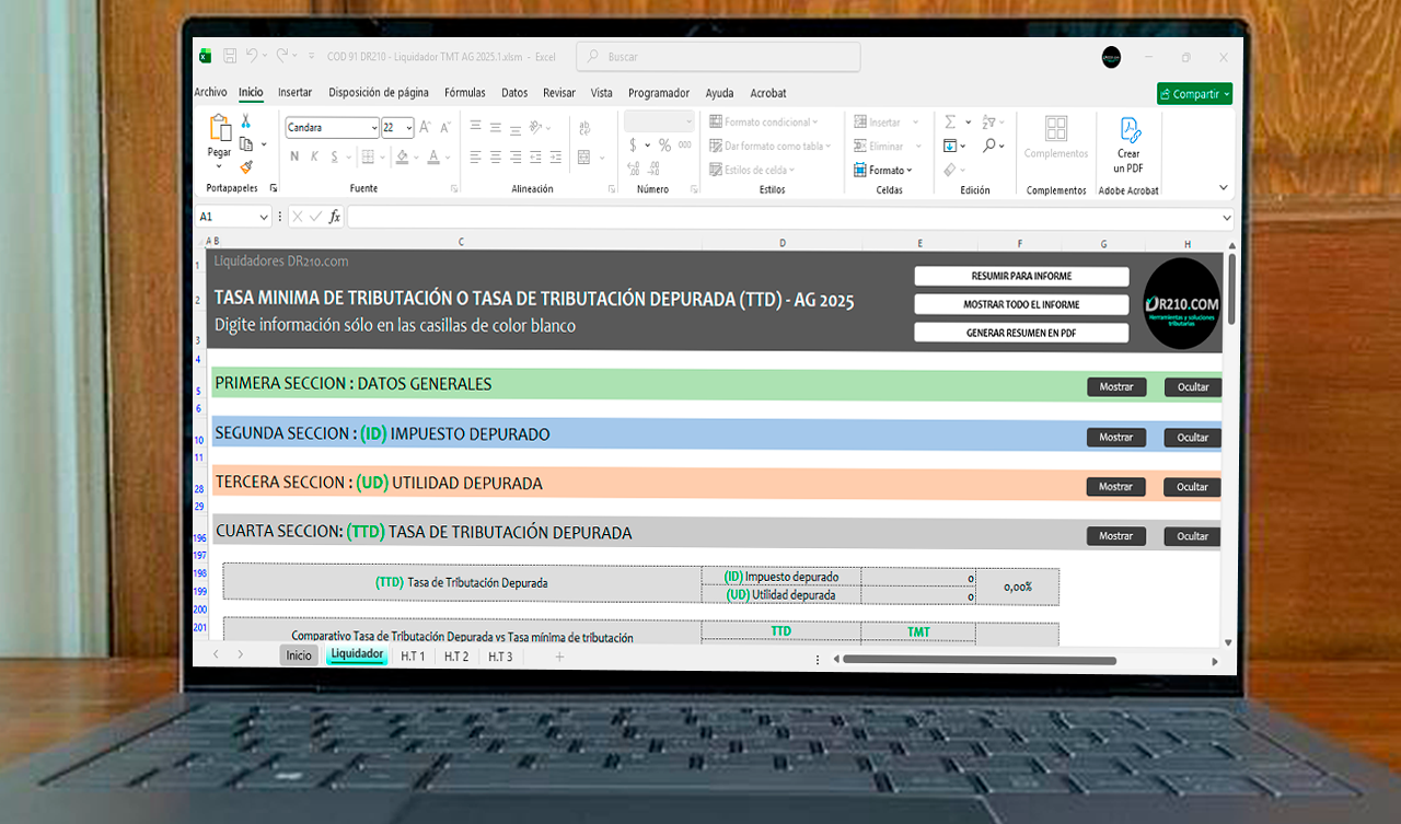 El liquidador permite calcular la Tasa de Tributación Depurada (TTD) o Tasa Mínima de Tributación para el año gravable 2025, de acuerdo con el Artículo 240 Parágrafo 6 del Estatuto Tributario, el cual, establece un procedimiento para que las sociedades nacionales no tributen sobre un porcentaje inferior al 15%.