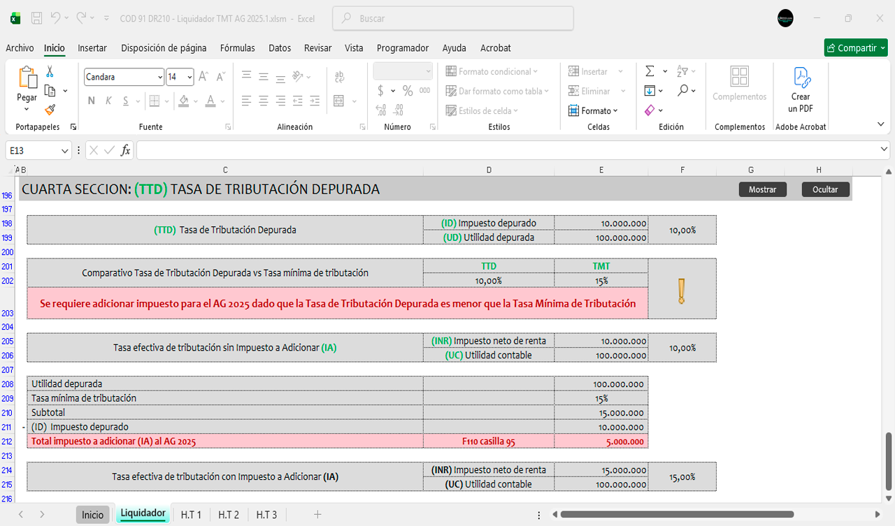 4. Sección de Tasa de Tributación Depurada (TTD): La herramienta automáticamente con los datos anteriores, calcula la Tasa de Tributación Depurada que consiste en dividir el Impuesto Depurado (ID) y la Utilidad Depurada (UD). Si la tasa es inferior al 15% la herramienta le mostrará el impuesto que debe adicionar en el Formulario 110 casilla 95.