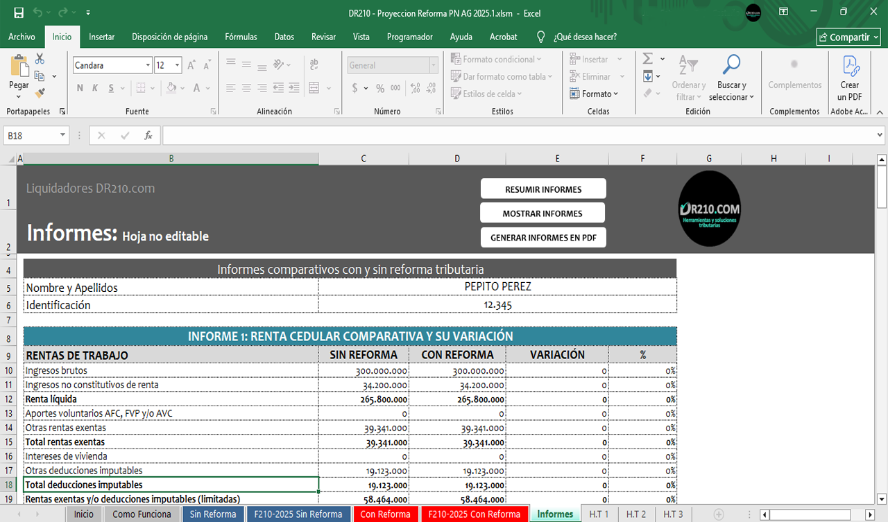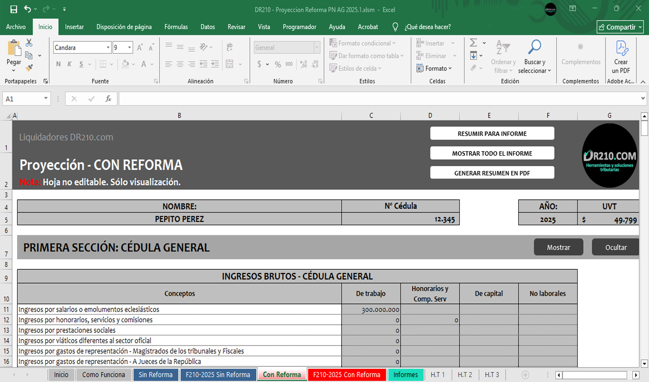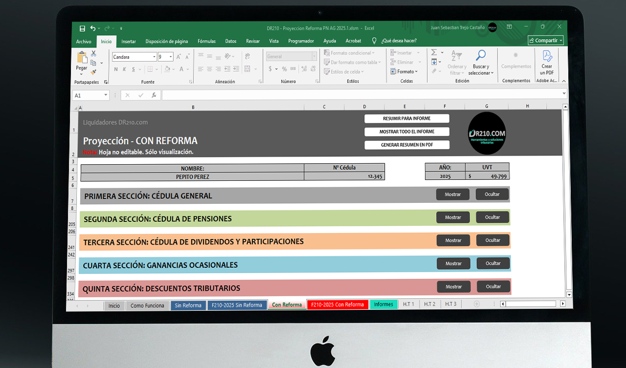 Está diseñado para contadores, asesores tributarios y firmas contables que requieran proyectar de manera práctica y confiable el impacto de la reforma tributaria propuesta por el Gobierno Nacional sobre el impuesto de renta de personas naturales no obligadas a llevar contabilidad.