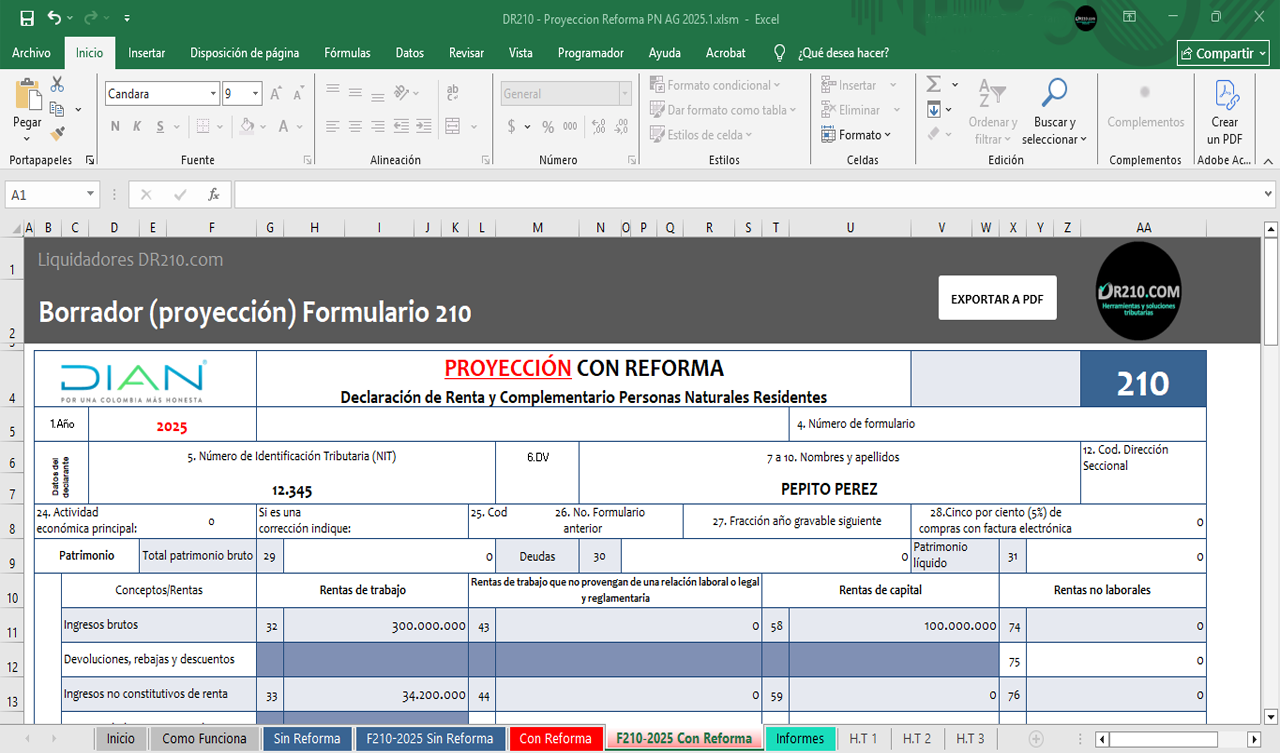 Generación del borrador del Formulario 210 con reforma tributaria, listo para comparar con el escenario sin reforma.