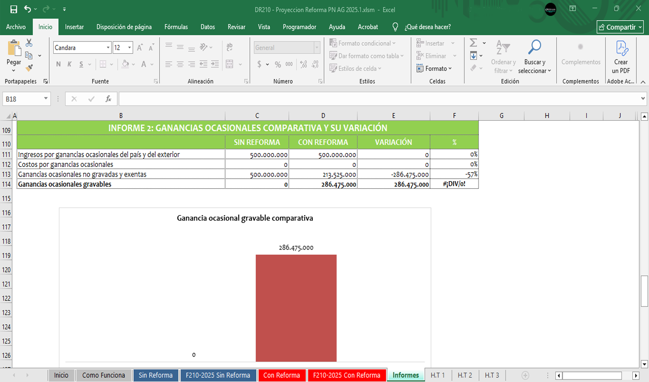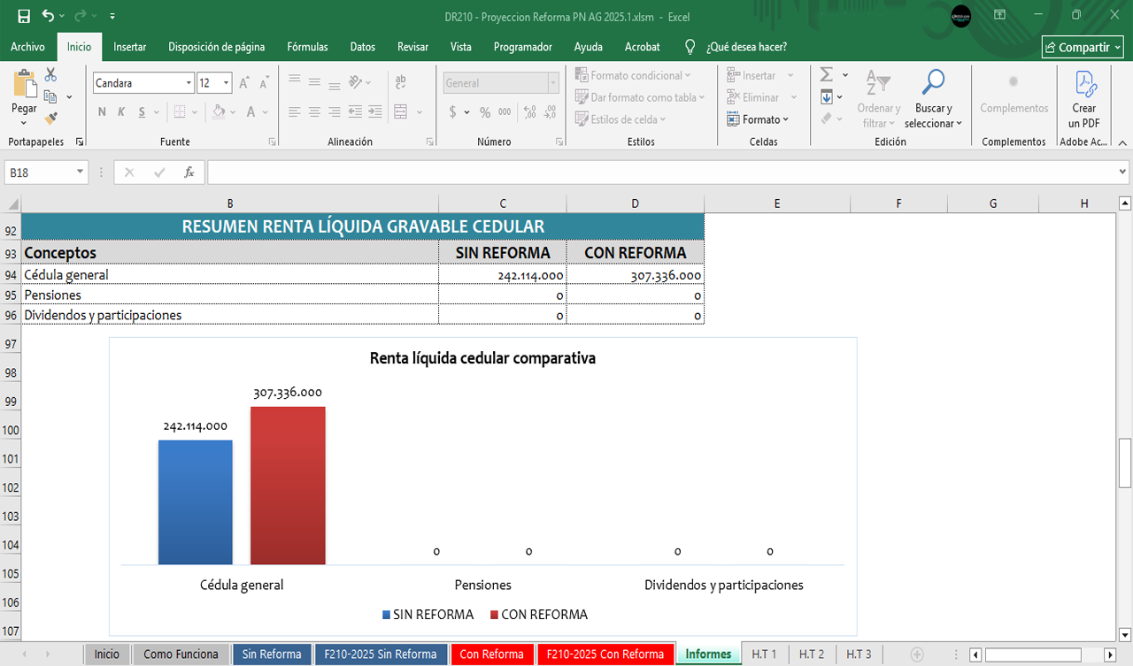 - Informe 3: Comparativo del impuesto sobre rentas líquidas gravables, mostrando el impuesto a cargo con y sin reforma.