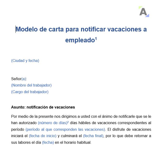 Según el artículo 186 del CST los empleados dependientes en Colombia tienen derecho a 15 días hábiles de vacaciones por cada año laborado. Los días en que el trabajador disfrutará sus vacaciones pueden ser acordados entre el empleador y el trabajador. Usa este modelo para elaborar dicha carta.