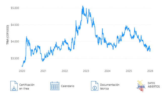 La TRM refleja cuántos pesos colombianos equivalen a un dólar estadounidense. Al cierre del 31 de diciembre de 2025, este indicador registró una caída del 14,79 % frente al valor observado el 31 de diciembre de 2024.